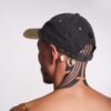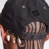Two toned distressed cotton dad hat. Nothing on the visor, three adornments on the back left side with shells, pearls and natural stones. PS icon embroidery on the center back. Velcro closure. Stainless steel notions. But the grommets will rust if you get it wet, adding to the distressed vibe as it ages. Unisex.